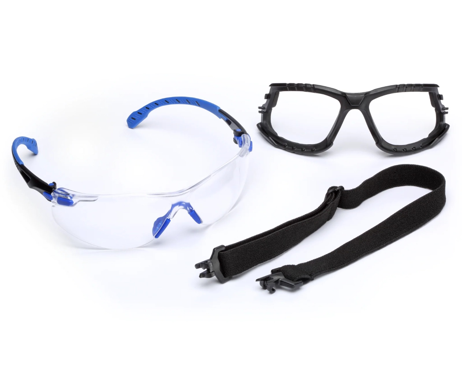 El kit de gafas protectoras 3M™ Solus™ Serie 1000 incluye unas gafas con un marco negro y azul de bajo perfil y lentes transparentes con recubrimiento anti-empañante Scotchgard™
